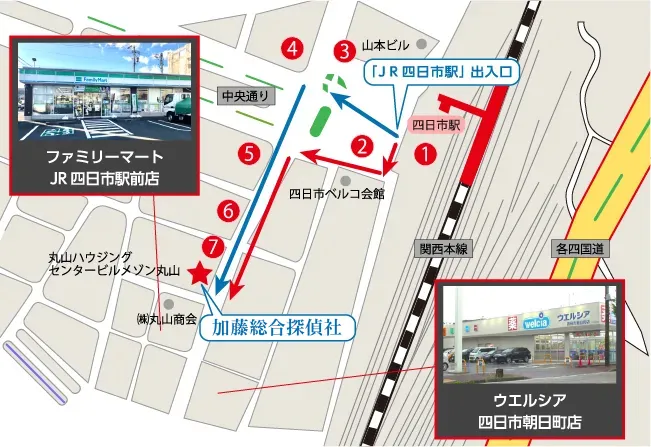 ●「JR四日市駅」から徒歩4分【お車でお越しのお客様へ】●当社事務所が入る「丸山ハウジングセンタービルディング」を正面から見て、階段の右に7台分、左に2台分、合計9台分の駐車スペースがございますので、空いている駐車スペースをご利用ください。
