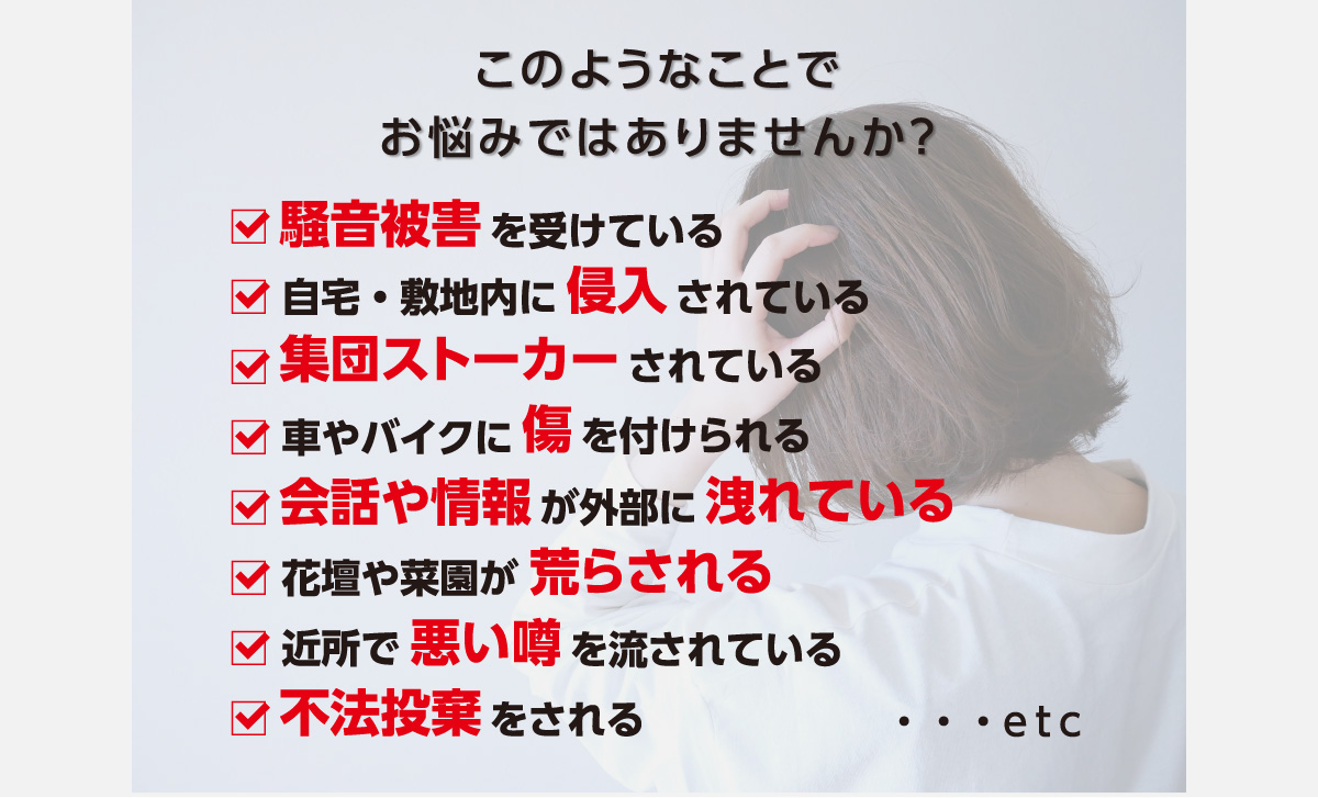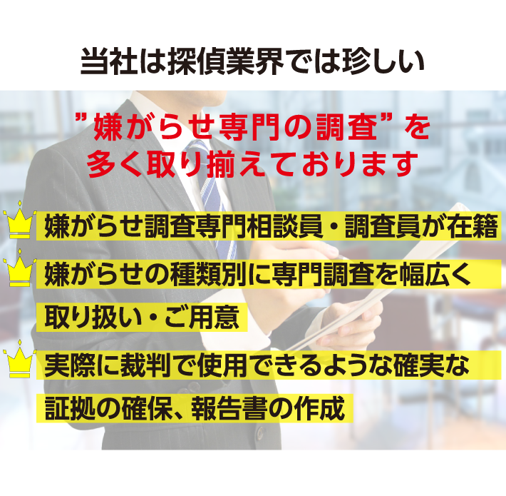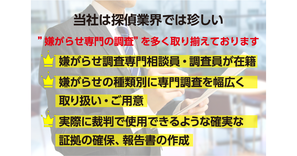 まずは面談にて嫌がらせのお悩み内容、現状、ご要望などお聞かせいただき、トラブルが解決できるよう調査のご提案、また調査に関する不安な点などお答えいたします。