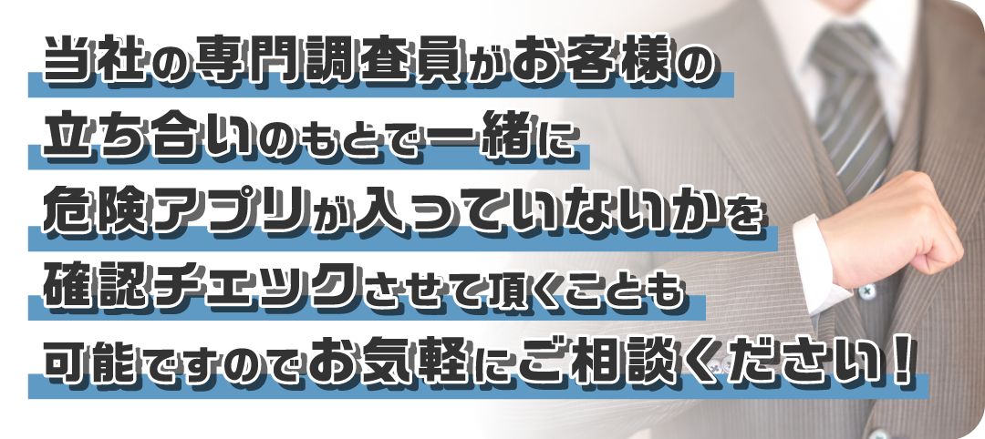 一人暮らしのマンションの部屋からは盗聴器と盗撮器が発見されることはありませんでした。詳細をお聞きするとスマホとタブレットが彼からのプレゼントであったことから、中の設定やアプリを確認させて頂いた結果、情報入手が可能な設定がされていることが判りました。その後、彼とは別れスマホ・タブレットを処分し新たな機種に買い換え、設定などはショップで行ったとのことでした。