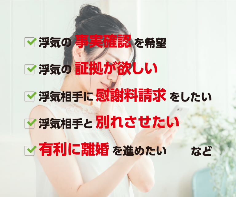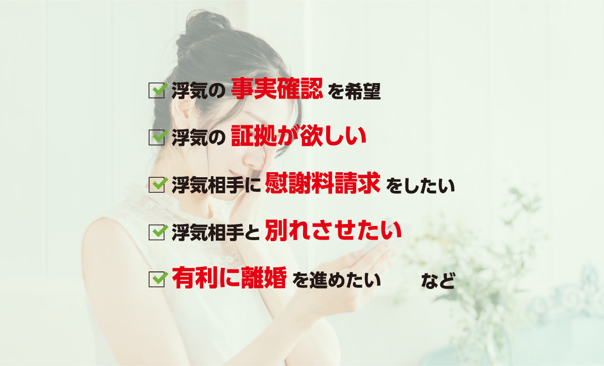 怪しい行動が見られた場合や浮気相手と会っていた場合など、調査時間の延長や変更もできますのでお気軽にご相談ください。 -